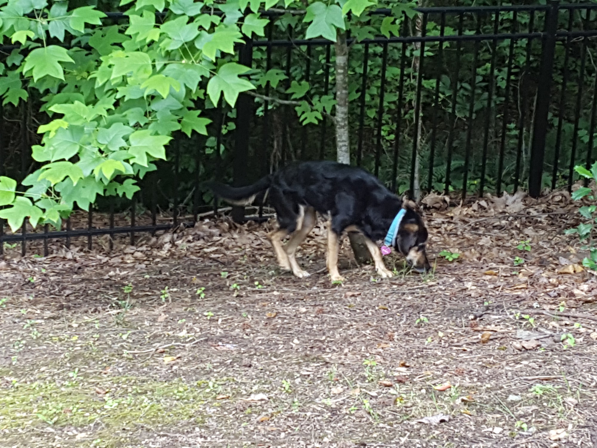 At first the yard smelled like other animals around the ends, and Blank in the middle (or like mint that Auntie planted in the raised bed). I started marking the yard from the middle outward, and now I am making sure other animals know this is my yard. I have started patrolling the fence, as you can see here. I have made sure that the yard smells like me, go out after each rain and am starting to enjoy my time in the yard as much as walking around the neighborhood.