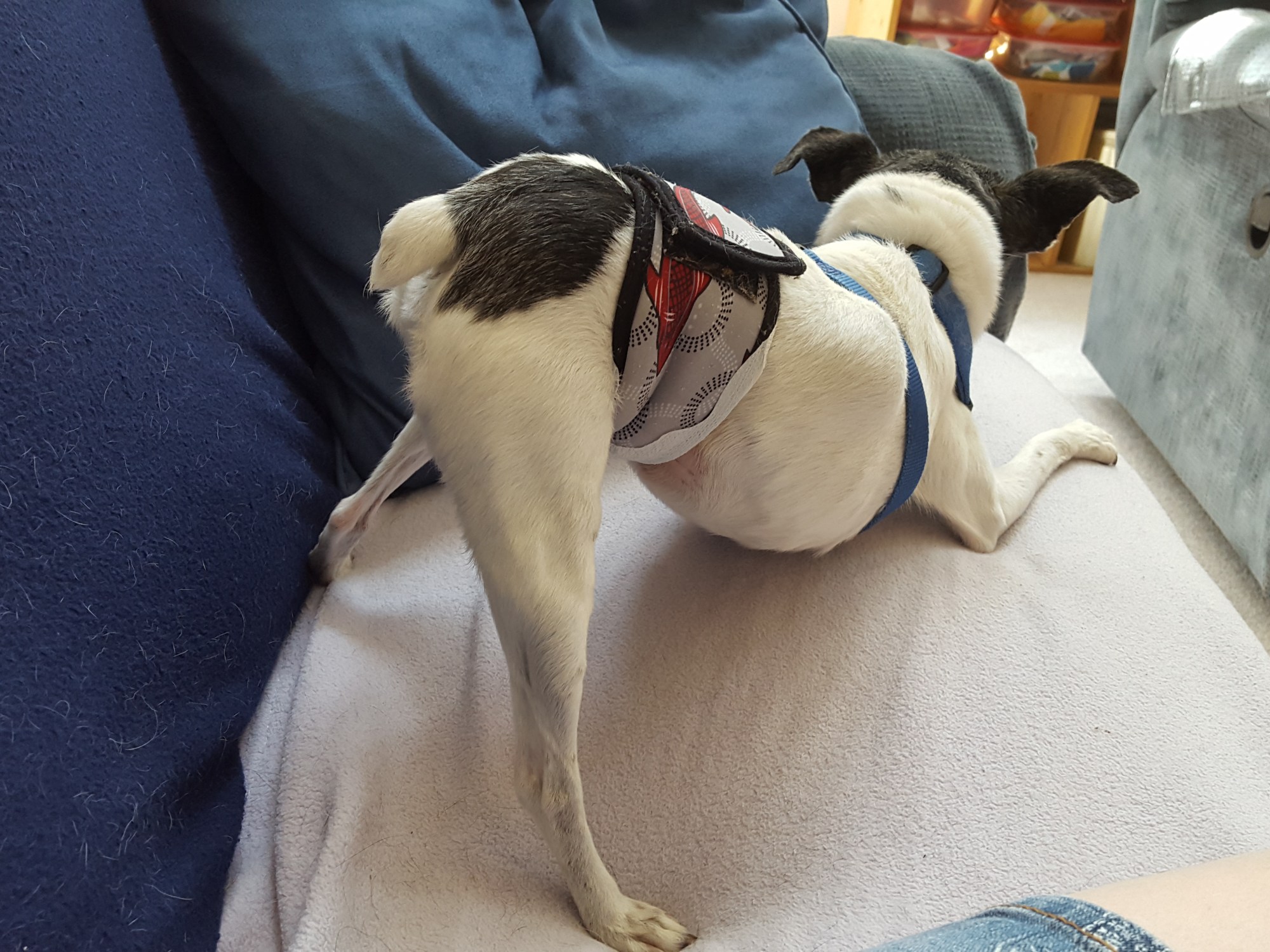 The belly band doesn’t prevent me from getting comfy, but the arthritis in my back legs does. That is why I do the downward facing dog yoga position before I lay down, it is the easiest way for my legs to get where I want them.