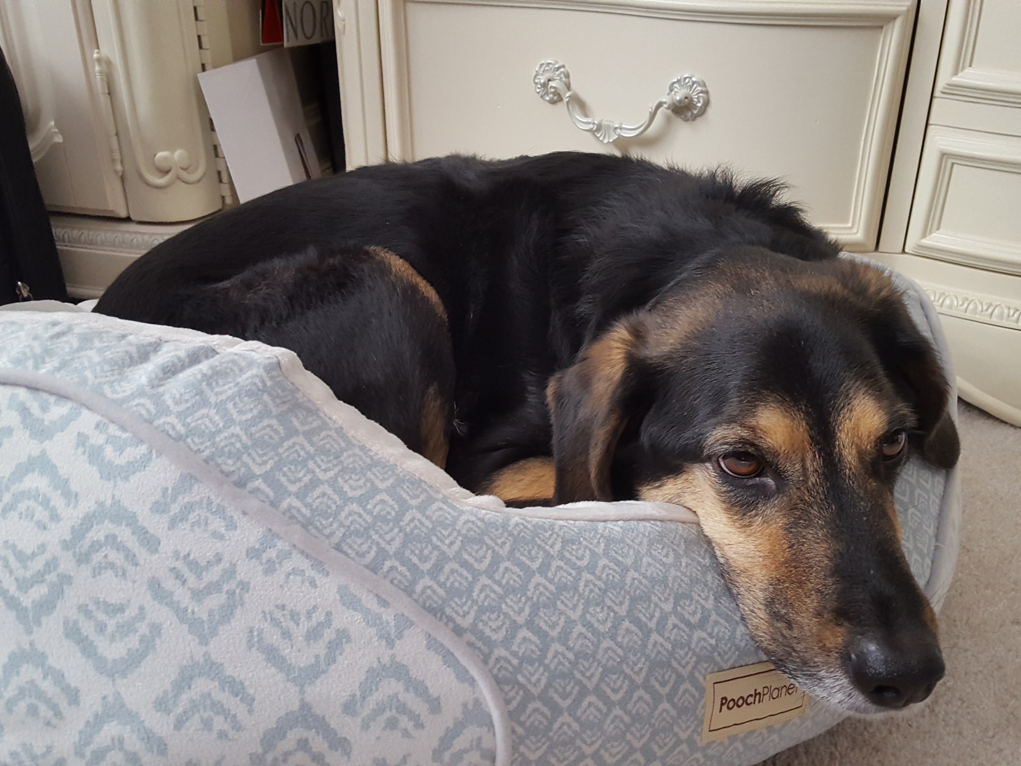 This is the face of a dog who ran out of pee and couldn’t finish marking the neighborhood spots.  Daisy cut the walk short herself at half a loop when she peed herself out marking the usually neighborhood spots to let her friends know she was visiting us again.  An attempt at the other half of the loop will be made once she has had more water.