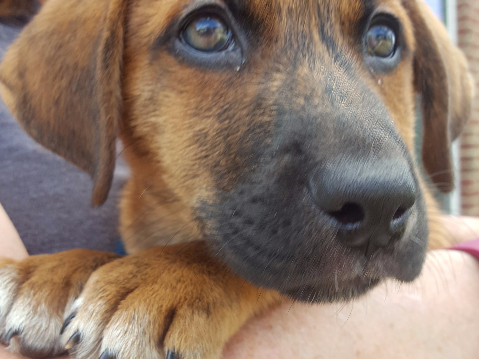 Daisy has accepted Nutter, and he is now welcomed to the blog. MomMom got to hold the puppy and we anticipate a rather large dog by the time Nutter is finished growing. Nutter is a rescue whose mother is about 65 pounds and the father is unknown. Right now Nutter can distract himself with his own tail.
