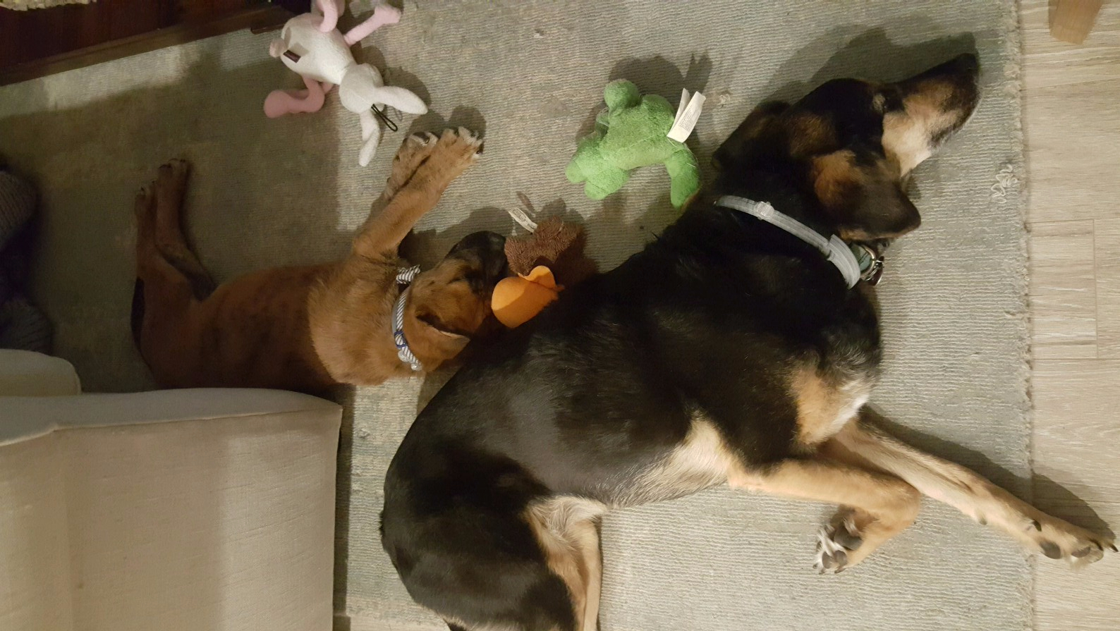 Daisy and Nutter are finally friends. Daisy has started to engage Nutter in play and as you can see in the heat of summer the two will down next to each other.