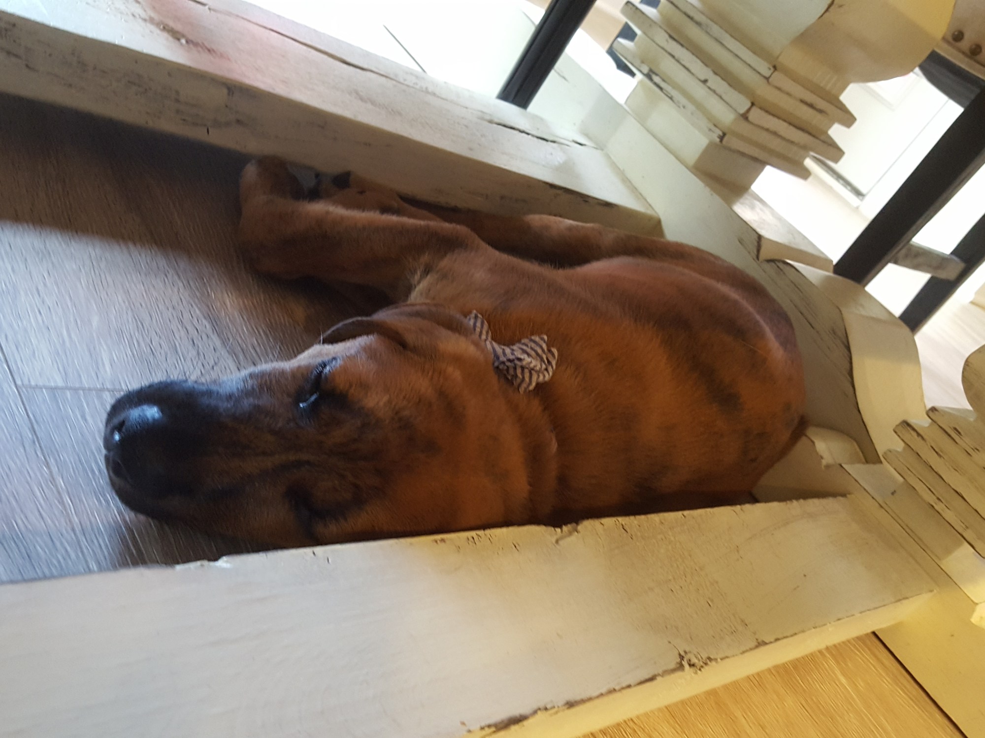 Nutter had another round of his puppy shots this morning, he has grown 6 pounds in the last two weeks and is now topping the scales at 20 pounds. We are anticipating a big dog. Once he got home went straight under the table and took a nap.
