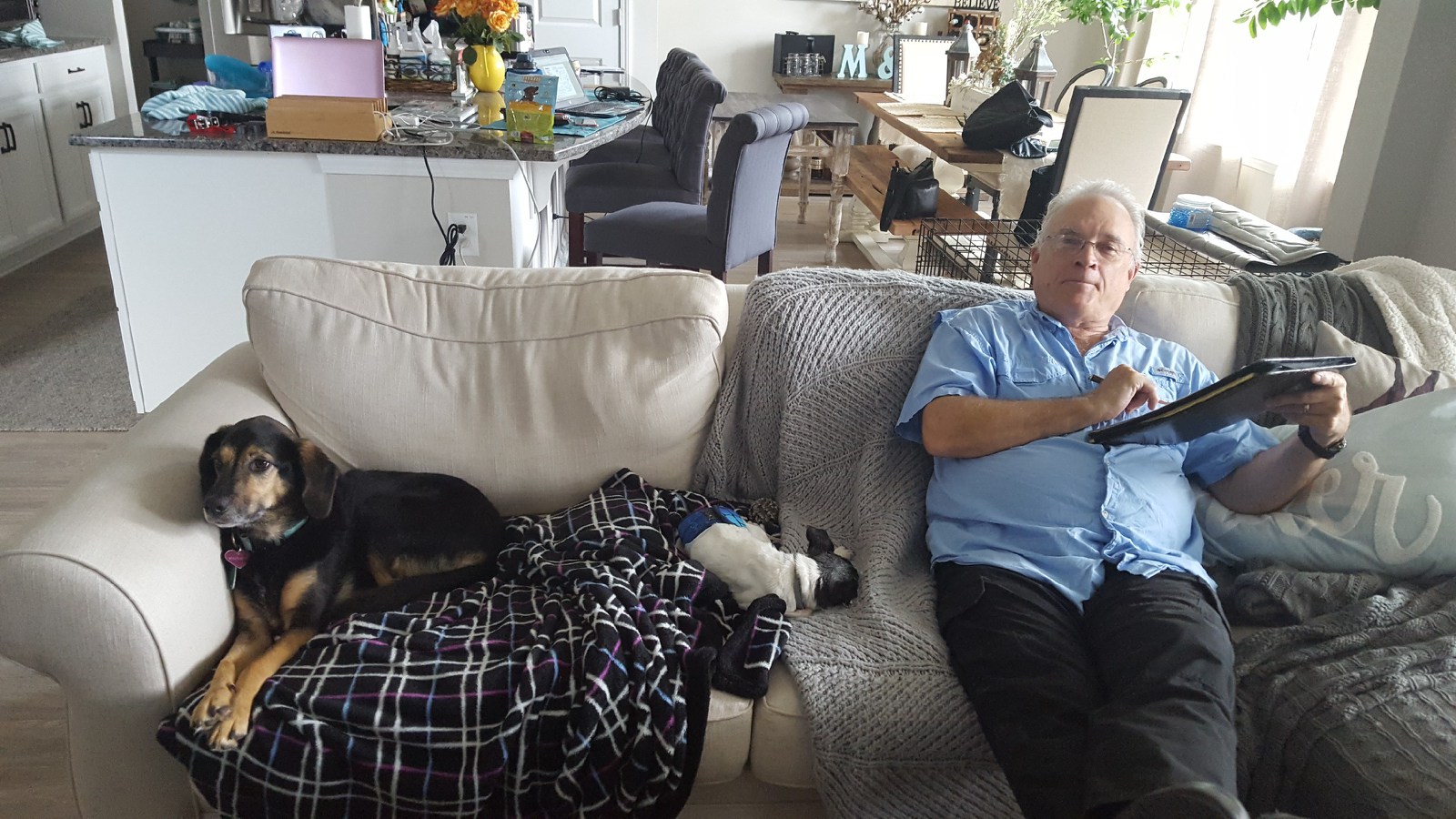 MomMom and The Big Guy helped Mom and Dad today by being at the house when guests came over to fix something in the house. The Big Guy loves his crossword puzzles and we know this routine from living with them for a year. The Big Guy sits down to do his crossword puzzles and we find spots on the couch near him.