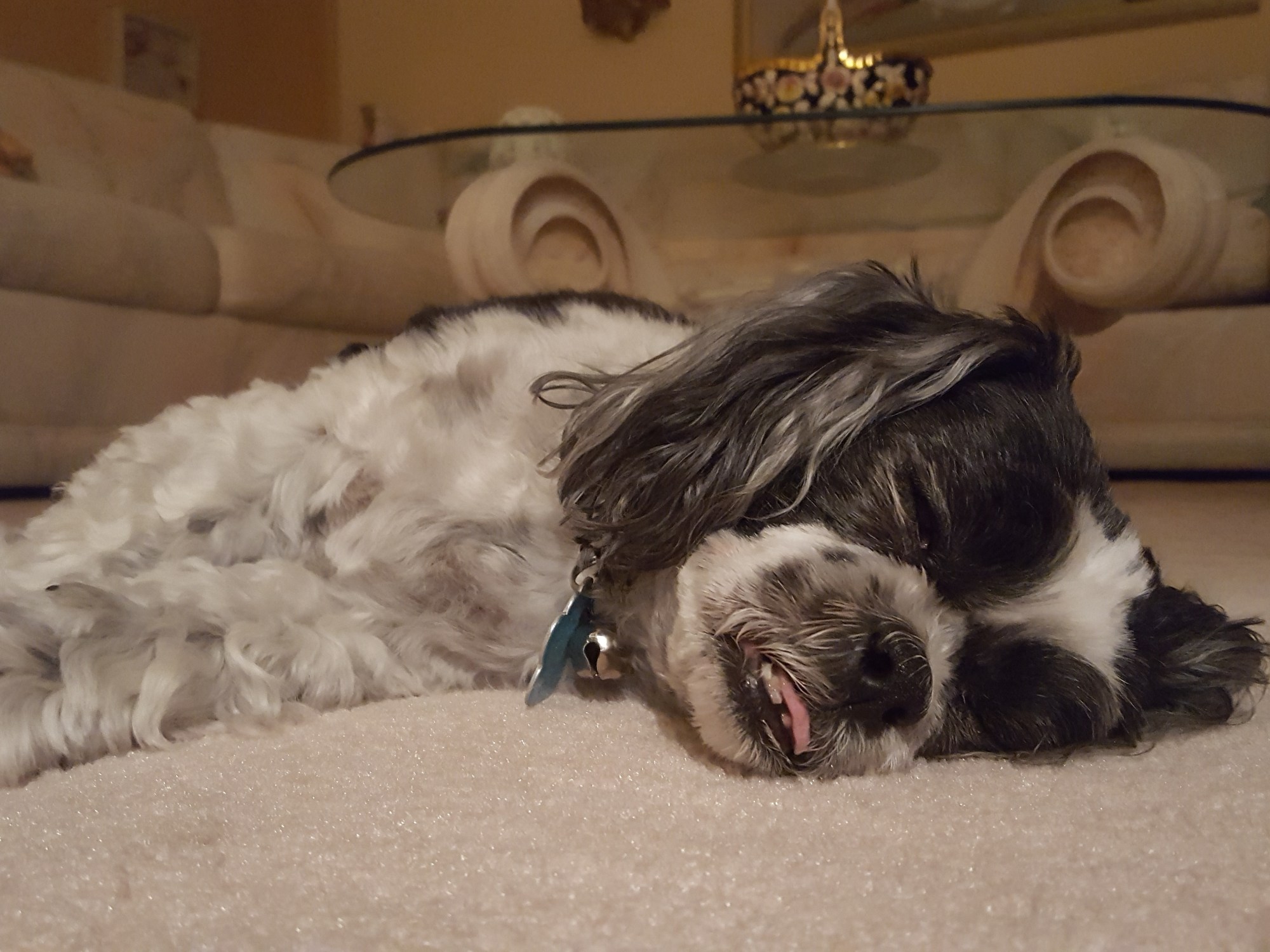 When I visit family members with dogs, I walk their dog to the point of exhaustion. Here is Showgun, my aunt’s dog, who is exhausted after a walk around the neighborhood.
