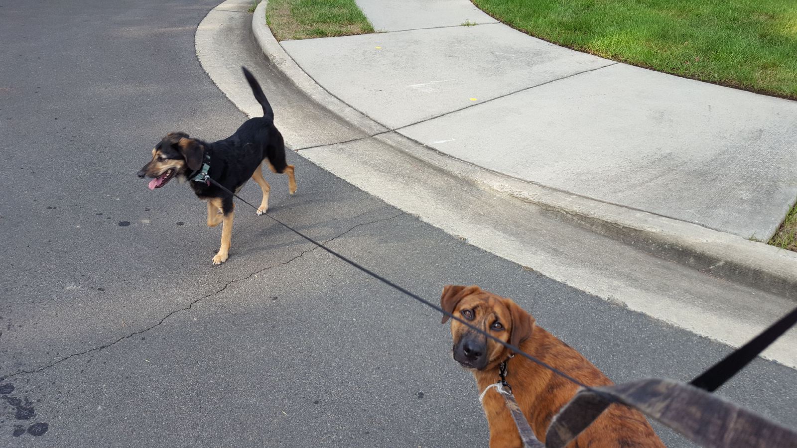 The Big Guy was in charge of these two dogs today. It took a little practice, but they are figuring out how to walk together. They finally did it, and The Big Guy took a picture to show the family what was accomplished (finger included in the photo).